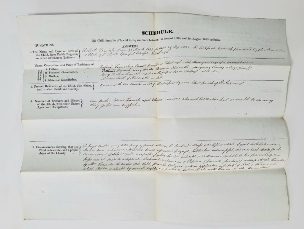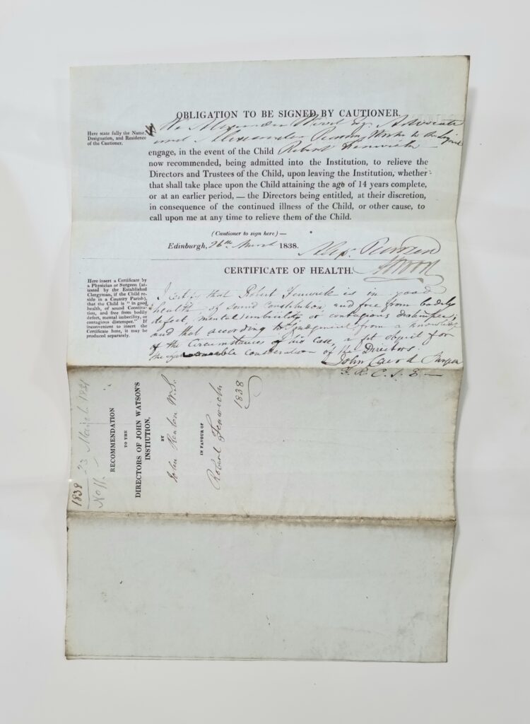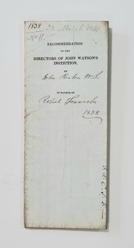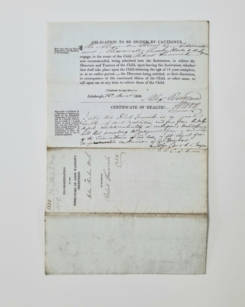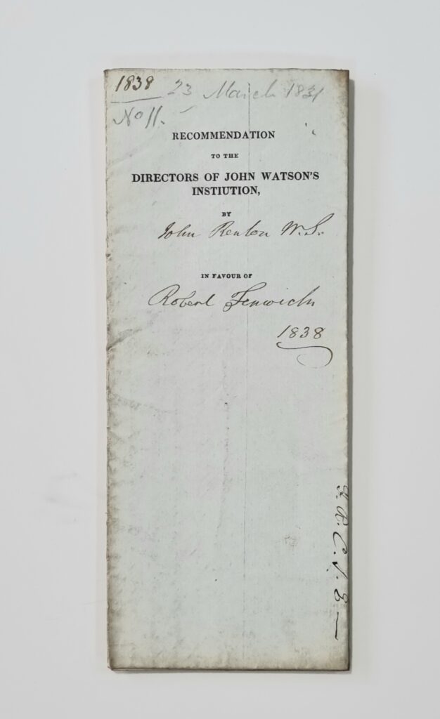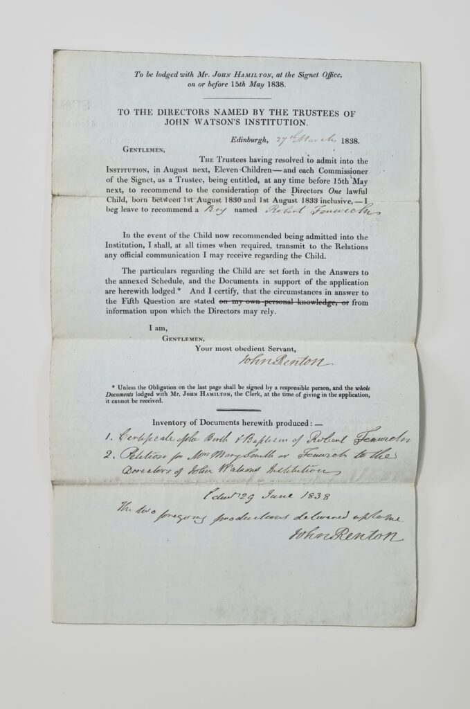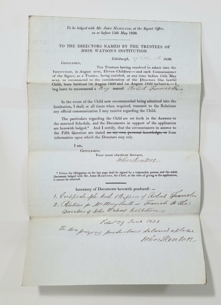 Robert Fenwick was born on 23 March 1831. His first application for admission to John Watson’s Institution in 1837 was unsuccessful. His second application in 1838 provided more information about his case and was successful.