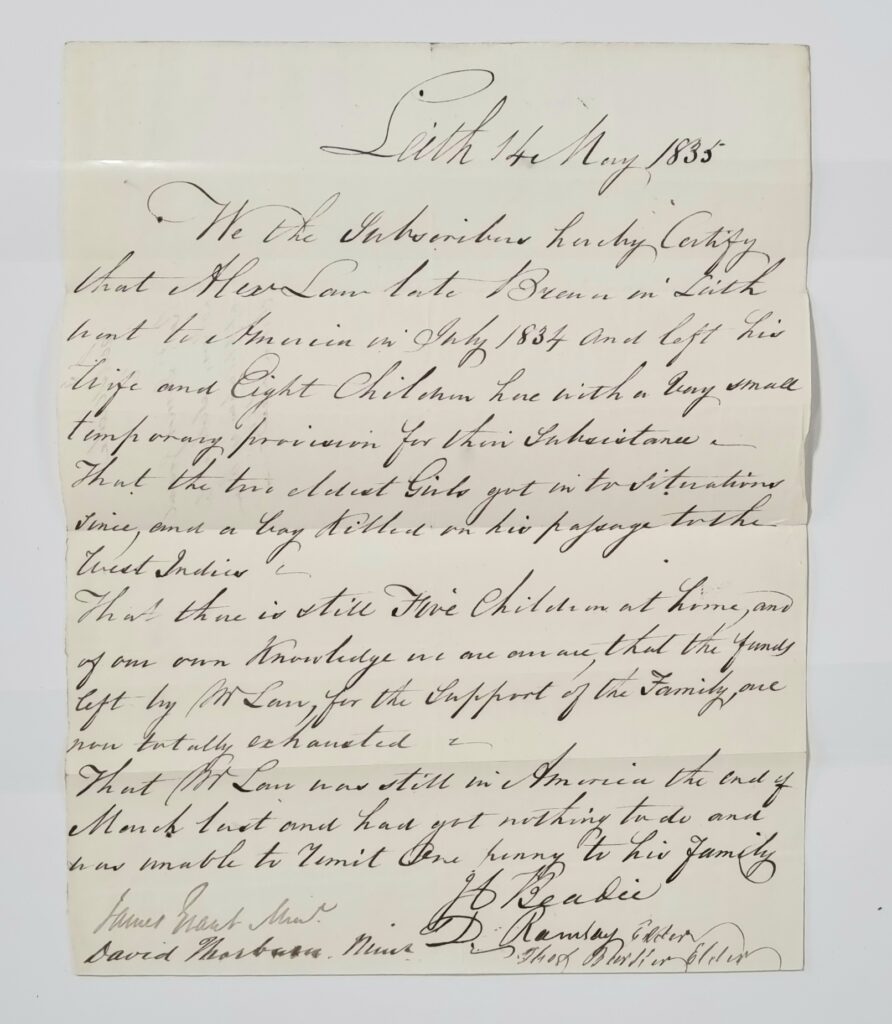 Leith 14 May 1835. We the Subscribed hereby Certify that Alexr Law late Brewer in Leith went to America in July 1834 and left his wife and Eight Children here with a Very small temporary provision for their Subsistence. That the two eldest Girls got into Situations since, and a boy Killed on his passage to the West Indies. That there is still Five Children at home, and of our own Knowledge we are aware, that the funds left by Mr Law, for the Support of the Family, are now totally exhausted. That Mr Law was still in America the end of March last and had got nothing to do and was unable to Remit One penny to his family.