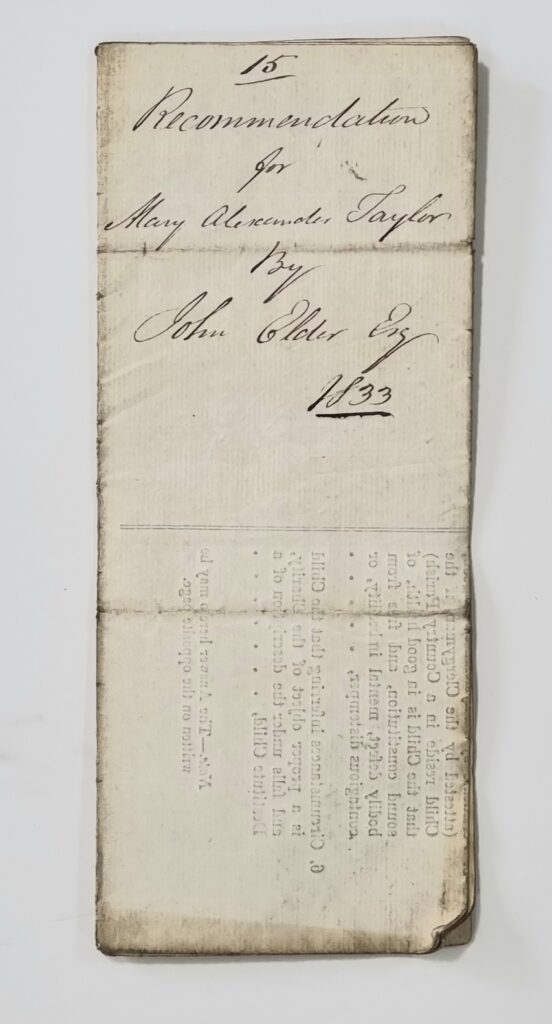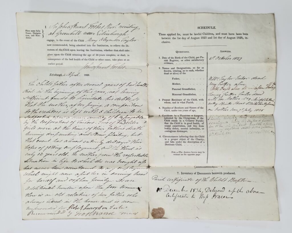 The child’s father after several years of bad health died in the beginning of this year, not leaving sufficient funds to liquidate his debts, so that the mother, after paying a compensation to the creditors is left with 5 children to be supported upon a small annuity of £14 payable by the Corporation of Tailors. Two of the elder girls were at the time of their father’s death learning dressmaking and Straw plaiting, but that event has almost entirely destroyed their hopes of getting employment, and the Third is only 12 years old. The mother from the respectable Situation in life to which she was brought up have never been accustomed to any employment which might now assist her in earning bread for herself and orphan family. As an Additional burden upon the Poor Woman there is an old relative of her father who always lived in the house and is now unprovided for.