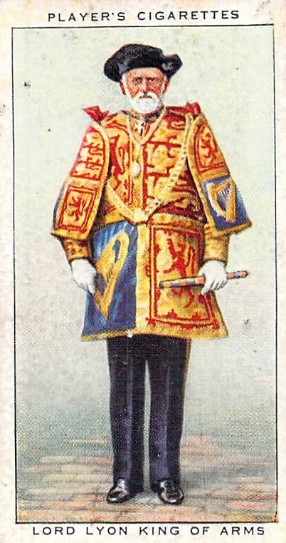 Born in 1863, He was the son of James Grant, Marchmont Herald, and would follow his father into the Lyon Court, becoming Carrick Pursuivant in 1886 a year before taking his oath as a Writer to the Signet. In 1898 he became Rothesay Herald and Lyon Clerk and Keeper of the Records in the Court of Lord Lyon. In 1925 he was made Convener of the Benefice Register and Church Records Committee and General Trustee of the Church of Scotland, and four years later King George V appointed him Lord Lyon King of Arms and Secretary to the Order of the Thistle. Always a distinctive figure, it is in his uniform as Lord Lyon that he is now chiefly remembered, and it is in this role that he – rather incredibly – became numbered among those WS to have been commemorated with a cigaratte card, or, in Grant’s case, several different cards from competing brands. The role of Lord Lyon is more than just a colourful ceremonial one: the Lyon Court is one of the key historical repositories, and the Lord Lyon themselves are one of Scotland’s key representatives and ambassadors.